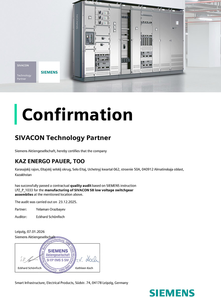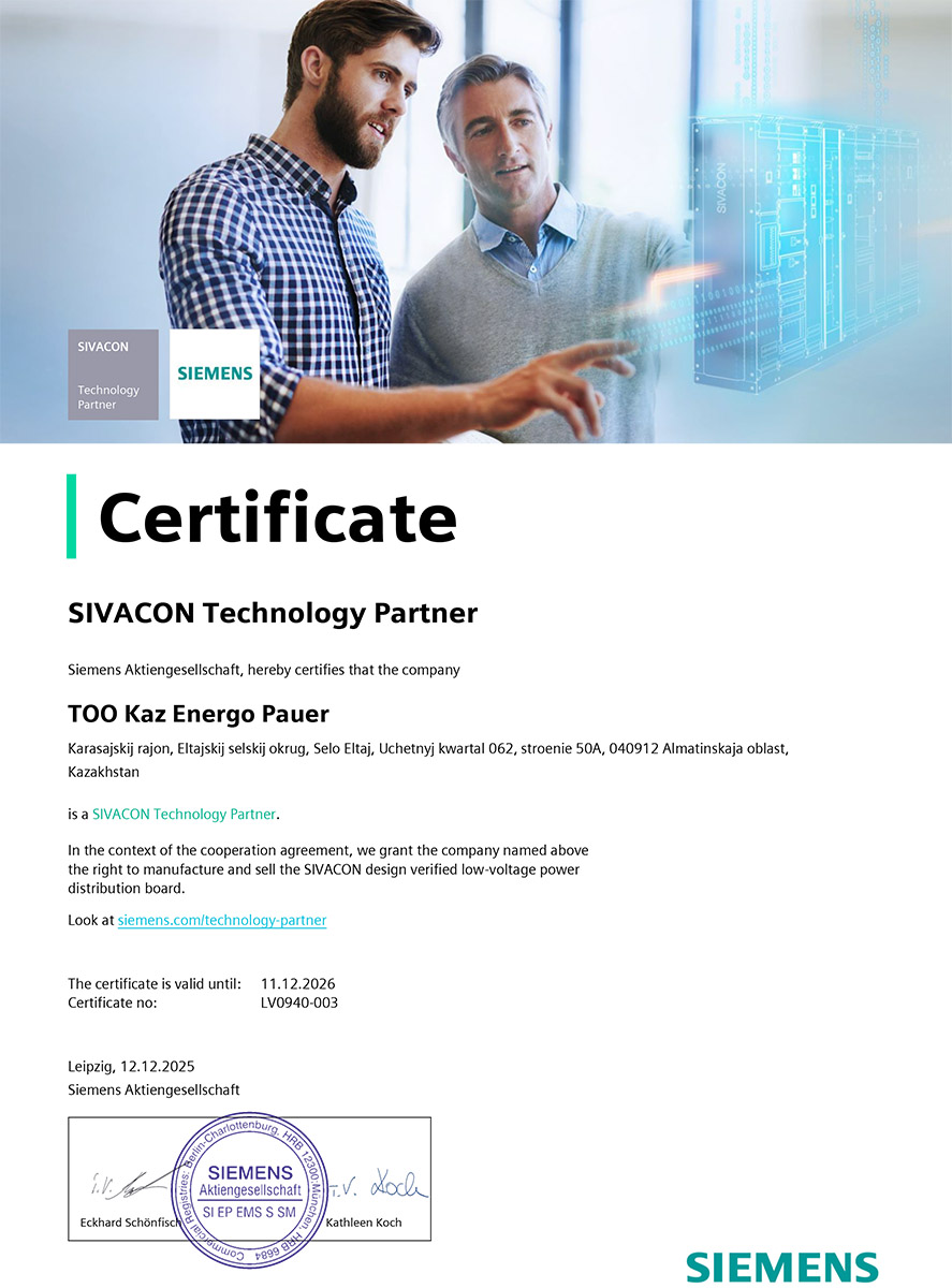 ТОО «Каз Энерго Пауэр» получил официальный сертификат SIVACON Technology Partner от Siemens Aktiengesellschaft, подтверждающий право на производство и реализацию низковольтных комплектных распределительных устройств SIVACON.